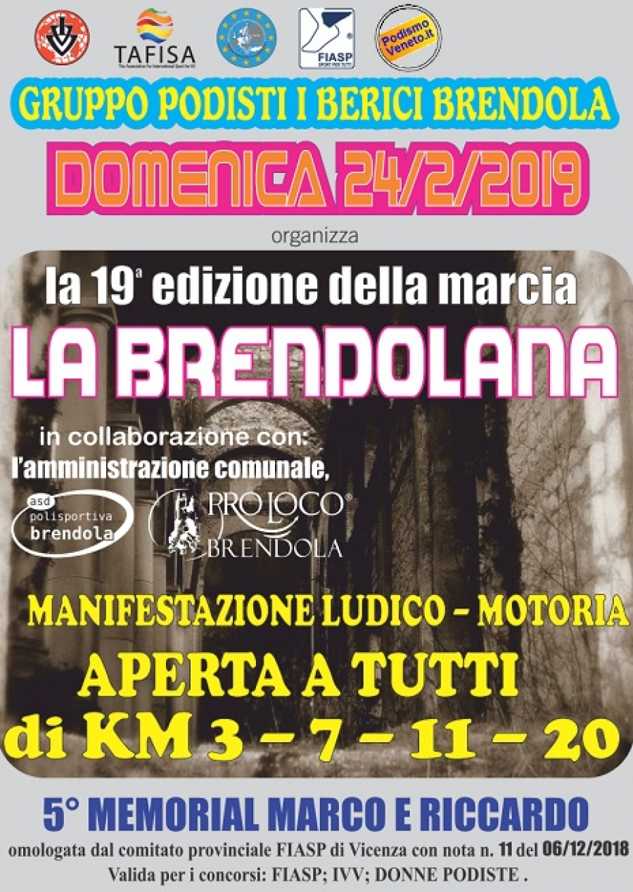 Domenica 24 febbraio 2019 Corri le Mura Corri sarà presente alla 19^ Marcia "La Brendolana" a Brendola (VI).